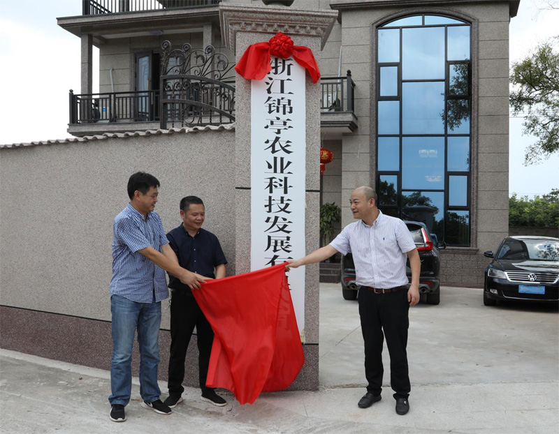 蘭溪市農業(yè)農村局局長(cháng)余樟士(左二)、水亭畬族鄉應榮軍書(shū)記(左一)與賴(lài)富榮董事長(cháng)共同為錦亭公司揭牌