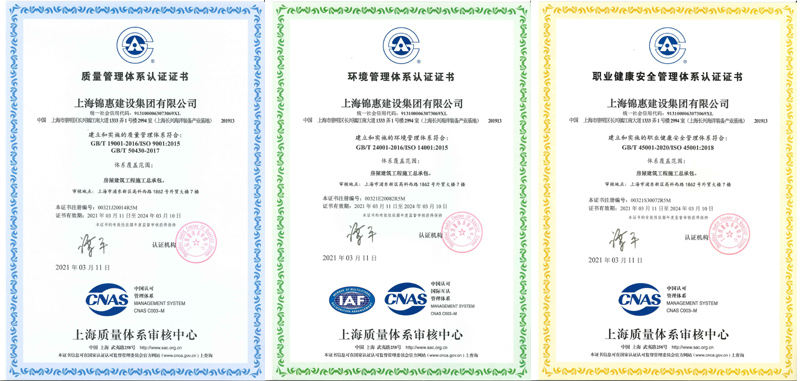 2021年1月14日,上海質(zhì)量體系審核中心對上海錦惠建設集團公司質(zhì)量、環(huán)境、職業(yè)健康安全管理體系現場(chǎng)運行情況進(jìn)行了全面細致的審核,最終認為我公司三標一體化管理體系運行情況良好,順利通過(guò)認證審核,取得了新的證書(shū)。